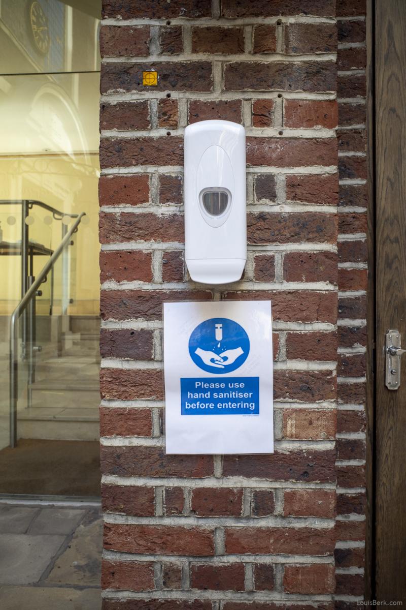 From the sublime to the highly necessary: (left) the beautiful entrance to the synagogue with a clear one way system shown on the floor, (r) hand sanitiser is to be used before entering the sanctuary.