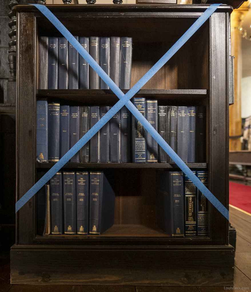 To avoid the spread of Covid-19 from shared surfaces the bookshelves are clearly marked as not in use. Instead, at each place a green card marks the seating for a congregant which is of course socially distant from his/her neighbour. The Rabbi places the prayer books which include a copy of the Pentateuch (the Torah, from which a portion is read during a service) and for male congregants a 'Tallit', or ritual prayer shawl at each place in the male section of the sanctuary. The idea here is to avoid anyone bringing into the synagogue materials and items which may contain Covid-19 on the surfaces. After the service has finished, all items are left in place and not touched again for 48 hours. This is in line with government scientific advice that the spores of Covid-19 are inactive after this time. The whole process will be repeated for each service.