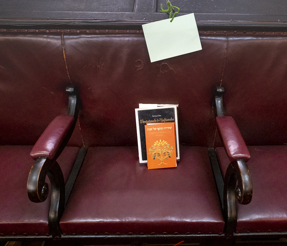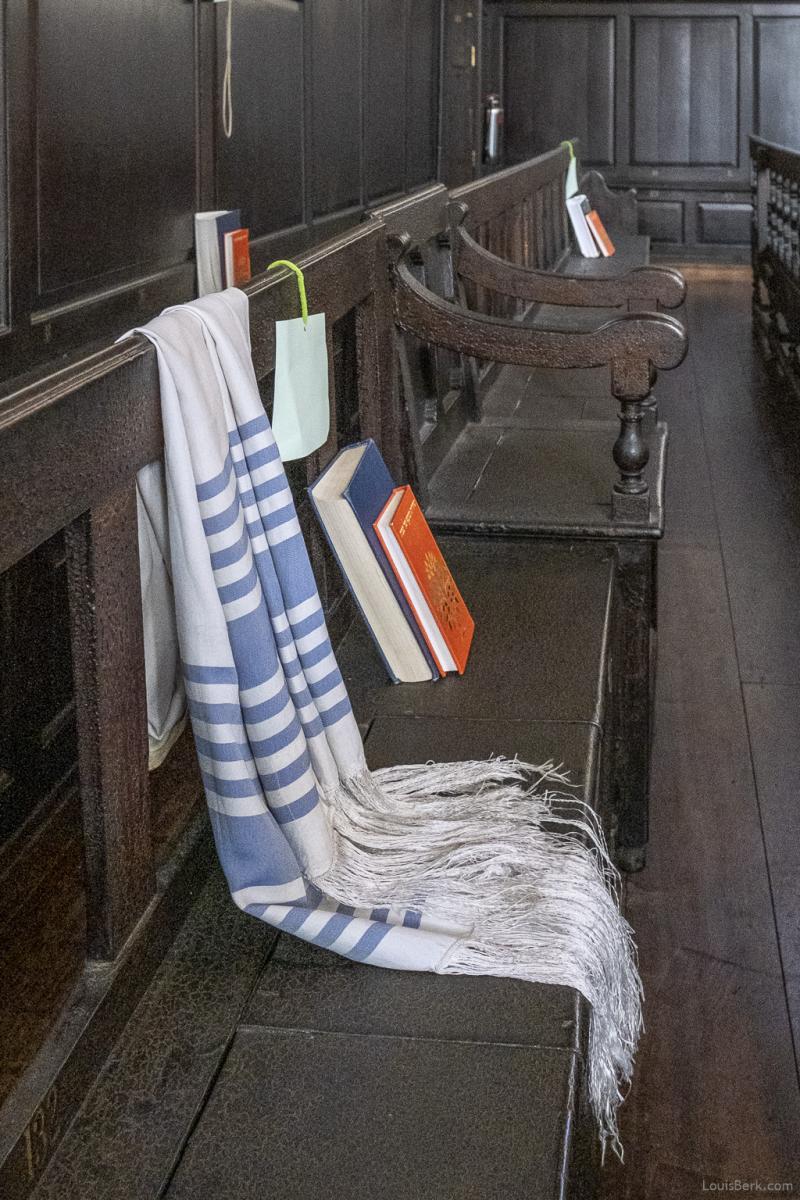 Protecting the congregants: (l) the book cases containing prayer books is clearly marked as not in use, (r) each place is marked with a piece of green card and and prayer books, and the ritual 'Tallit' or prayer shawl for male worshippers.